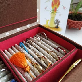 Часть2. Картонажная коробка, она же хранительница стальных помощников, моя первая коробка для ножниц. Я давно думала, как и где люди хранят огромное количество ножниц, пока у самой коллекция росла.. Примеряла варианты, но деревянные органайзеры, тканевые чехольчики, рамки-картины, не подходили к моим нуждам: хотелось, чтоб все сразу в одном месте, мобильно, доступно, эстетично и при этом бережно, не царапая🤔. Однозначно в основе должна быть ткань, значит, #тканевойкартонаж 💡☝🏻